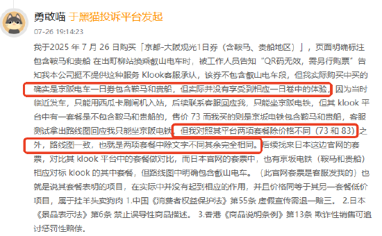 在本月中,多名消费者反应平台对产品或服务的介绍与实际不符,耽误行程且拒不退票,消费者购客路 “京都 - 大阪观光 1 日券(含鞍马、贵船)”,页面标注包含该两地。但换乘叡山电车时,QR 码无效需另购票,客服承认券不含此段。平台同类低价套餐路线图与之一致。后续客服无效回答拒不退款。本月中,客路旅行累计投诉件671件。