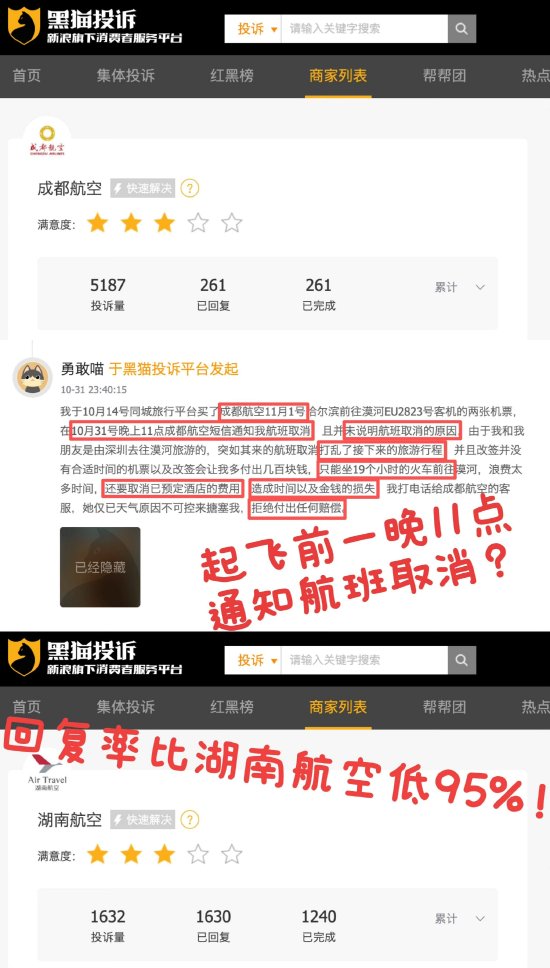 近期,有消费者向黑猫投诉 【下载黑猫投诉客户端】反馈,自己购买成都航空机票后在起飞前一晚11点被短信通知航班取消,且未说明取消原因。消费者的行程被全部打乱,要改坐19个小时的火车前往目的地,还要取消预定酒店,导致时间及金钱损失,然而航司却拒绝提供任何赔偿。截至目前,成都航空在黑猫投诉平台投诉累计达5187单,回复率仅为5.03%,比湖南航空低95%。
