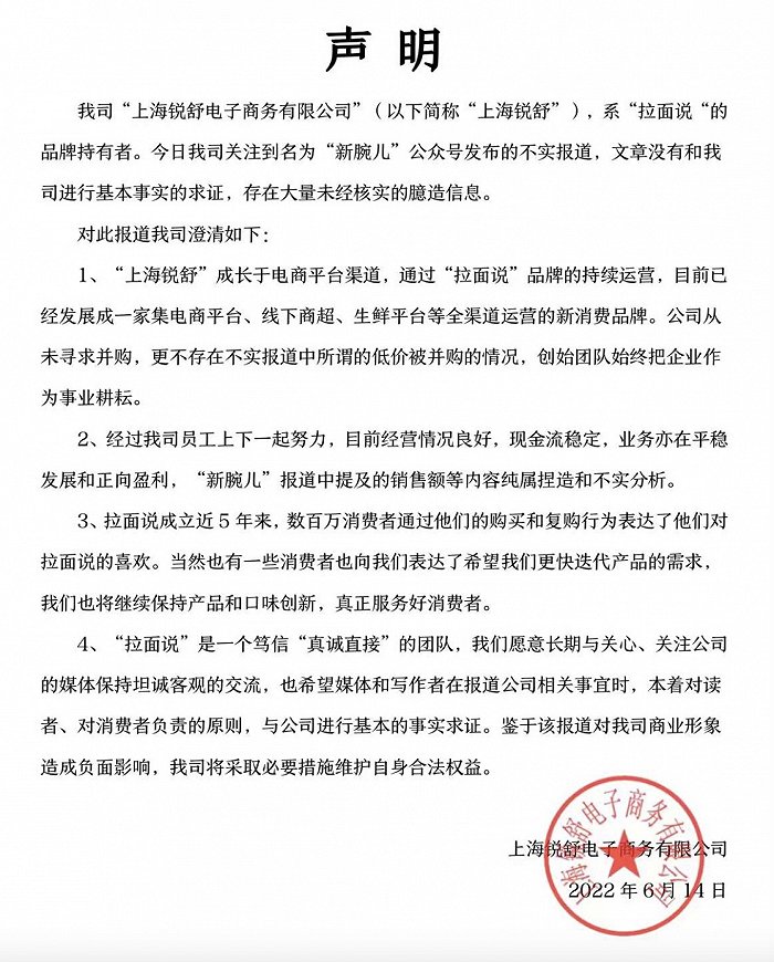 随后,拉面说发布声明指出,公司从未寻求并购,且现金流稳定。针对上述文章中引用的销售额等数据,“新腕儿”未与品牌方进行核实,系捏造。