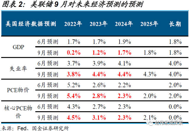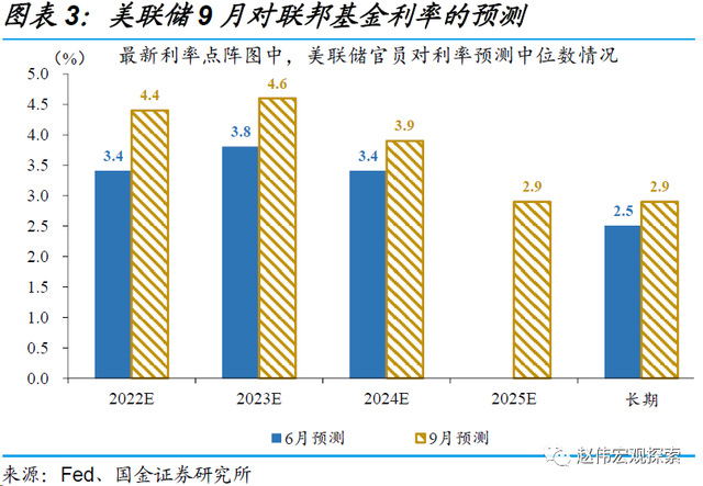 作为季末会议,美联储公布最新经济预测,下调未来三年GDP增长预期,上调通胀、失业率及政策利率预测。其中,2022、2023、2024年GDP增速预期分别由1.7%、1.7%、1.9%下调至0.2%、1.7%、1.9%;PCE通胀预期分别由5.2%、2.6%、2.2%上调至5.4%、2.8%、2.3%;失业率分别由3.7%、3.9%、4.1%上调至3.8%、4.4%、4.4%,暗示可容忍失业率升破4%。利率点阵图显示,联邦基金利率预计在未来三年升至4.4%、4.6%、3.9%,分别较6月预测上调100bp、80bp、50bp。