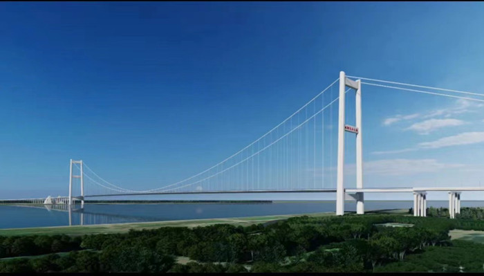 中铁大桥局双柳长江大桥项目部总工程师刘润泽介绍,双柳长江大桥为双塔钢箱梁悬索桥,具有“跨度大、桥面宽、主塔高、材料新”四大特点。跨度大,主跨为1430米超大跨径,处于同类型结构前列。桥面宽,采用双向八车道建设标准,桥梁全宽 50.5 米。主塔高,南岸主塔高度为212.75米,塔高处于国内同类型桥梁前列。材料新,主缆钢丝采用新型锌铝稀土合金镀层钢丝,提高了钢丝耐腐蚀性能;钢箱梁U肋和板肋采用新型摩擦型环槽铆钉连接,相对高强度螺栓,增强了连接耐久性;桥面采用了钢-轻质超高性能混凝土组合,提高了混凝土性能,减轻了桥梁重量,延长了桥面铺装的使用寿命。