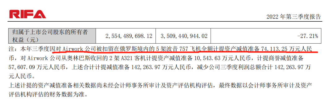 其中,公司对Airwork公司被扣留在俄罗斯境内的5架波音757飞机,合计计提固定资产减值准备17563.63万新西兰元(折合人民币约7.41亿元)。
