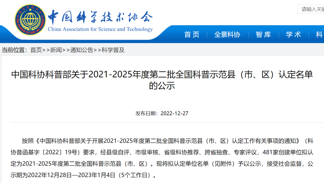 近日,中国科协科普部公示2021-2025年度第二批全国科普示范县(市、区)认定名单。481家创建单位拟认定为2021-2025年度第二批全国科普示范县(市、区)。其中,黑龙江省17家创建单位入选。