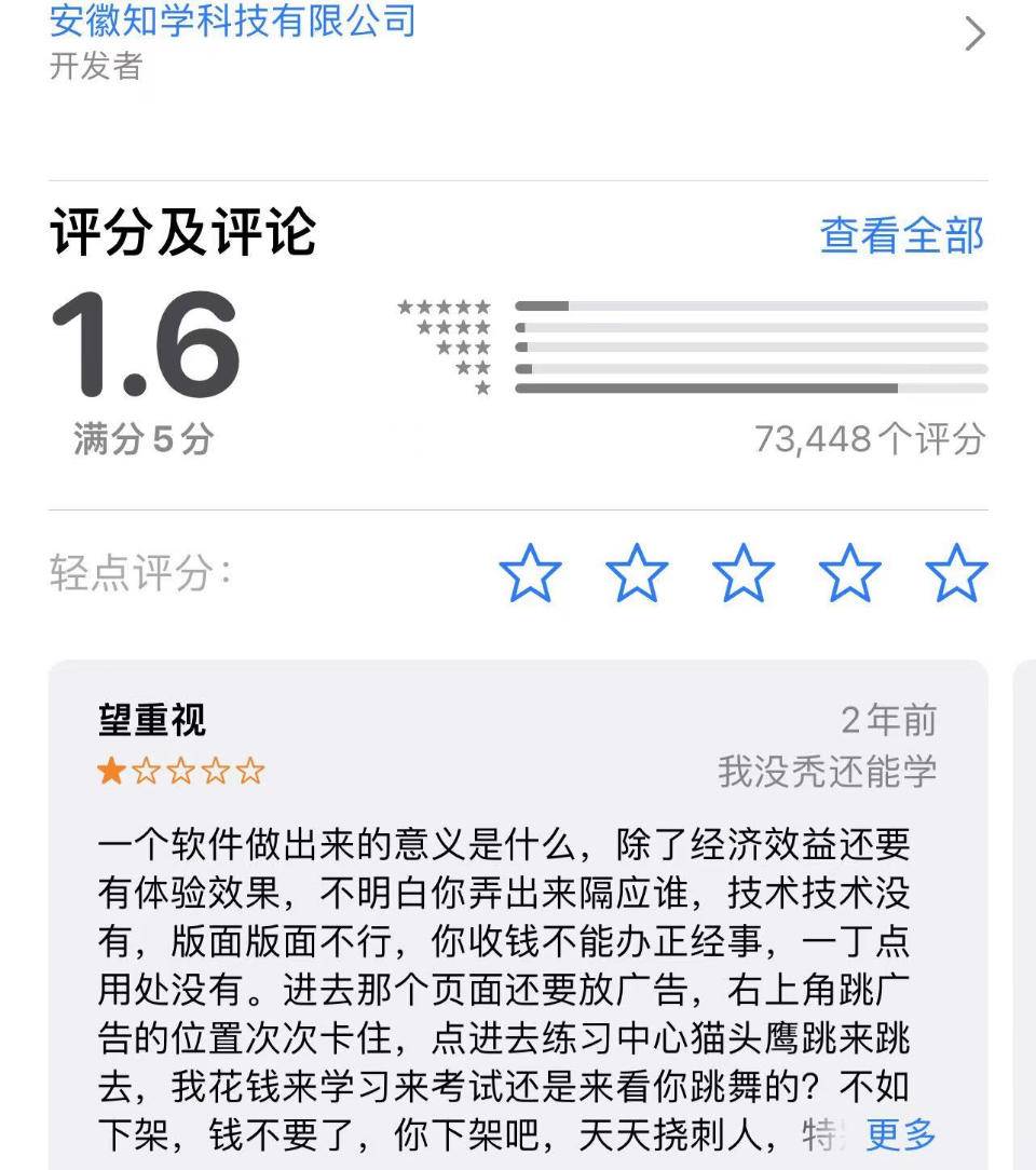 智学网作为科大讯飞的一项“明星产品”,在产品认可度和推广效果上似乎不及预期。记者在苹果商城搜索“智学网学生端”时发现,该APP获得7.3万个评分,最终得分仅为1.6。其中,高频“槽点”有:登录不进去、无法上传作业、软件闪退、UI设计差等等。
