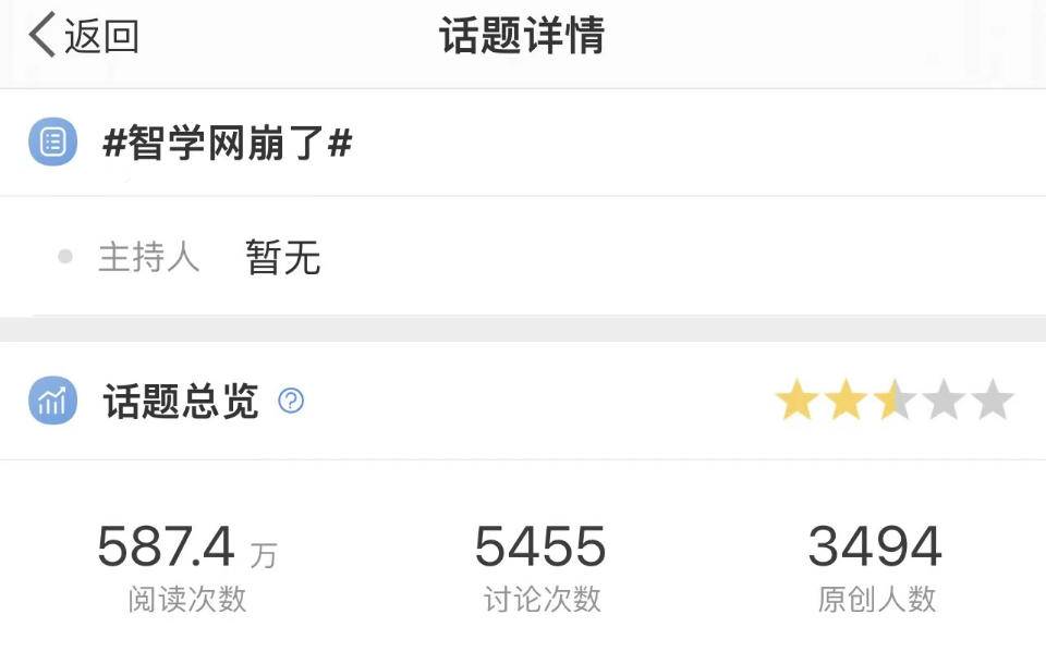 在新浪微博话题中,“智学网崩了”话题阅读量达587.4万,并有5455条讨论留言。有学生表示:“经常闪退、登陆不上去,比较考验我们耐心”,好在也有用户反映称:“去年更新以后,情况感觉好多了。”