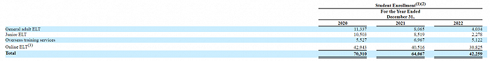 作为教育公司,美联教育的营收下滑很大程度上源自学员数量的断崖式减少,2022年学员数共42259名,比2021年大幅减少21808人。根据财报,其成人英语培训人数在2022年降至4034人,仅相当于2021年的一半,更是仅为2020年的三分之一左右。