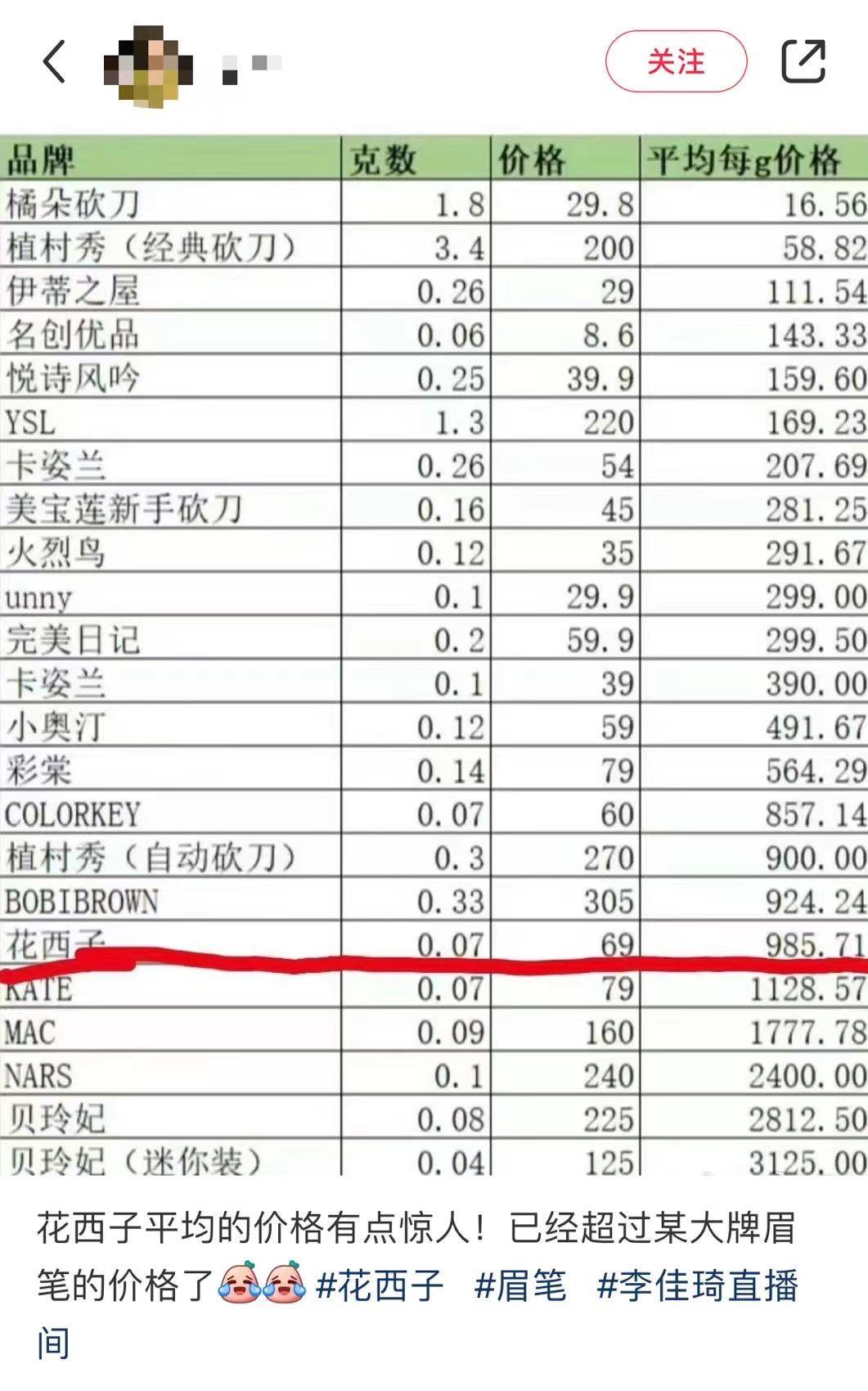 有网友列出了花西子眉笔和其他品牌眉笔单克重数价格的对比。其中,花西子标价69元的眉笔含量为0.07克,以单克换算价格高达985.71元。按同样的单位换算,国外品牌植村秀经典砍刀眉笔每克仅58.82元。