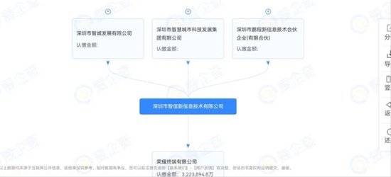 据工商查询平台爱企查,深圳智信是由深圳市智慧城市科技发展集团(下称“深圳智慧城市”)与30多家荣耀代理商、经销商共同投资下,于2020年9月成立的一家以从事计算机、通信和其他电子设备制造业为主的企业。