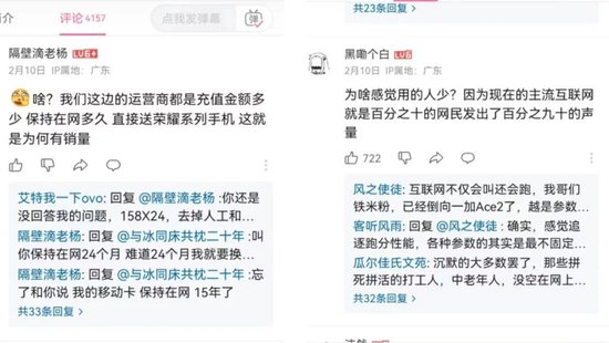 在评论区,IP地址为广东的网友评论道,“我们这边的运营商都是充值金额多少,保持在网多久,直接送荣耀系列手机。”但也有网友认为互联网上的声音并不客观,反驳道,“现在的主流互联网上,百分之十的网民发出了百分之九十的声量。”