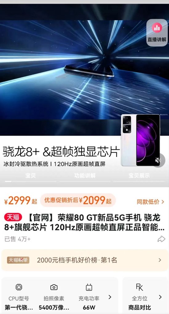 2022年年底,荣耀发布了荣耀80 GT。其中,12+256GB版本的售价高达3299元,如今却降到了2099元,一年之间直降1200元。