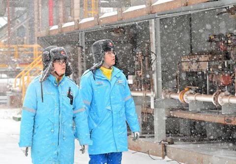 12月14日,河北省唐山市曹妃甸区中石油唐山LNG接收站工作人员在厂区巡查。