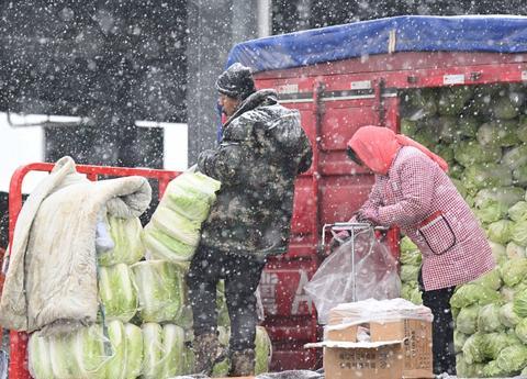 12月14日,商户在河北省石家庄国际农产品批发交易中心包装蔬菜,供应市场。