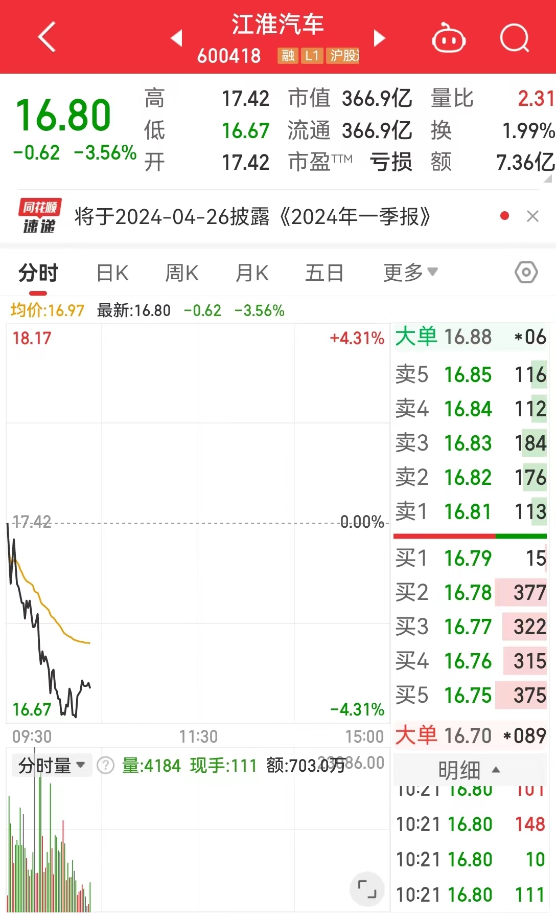 截至发稿,江淮汽车(600418.SH)报16.8元/股,跌幅3.56%,市值366.9亿元。