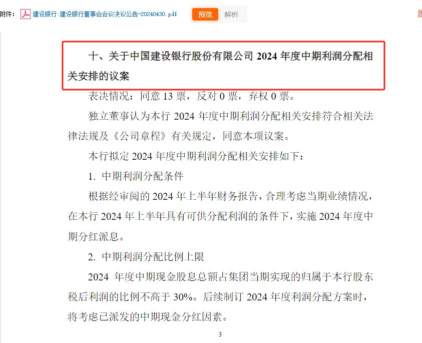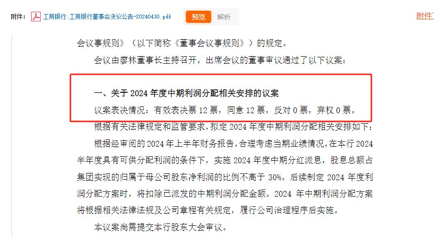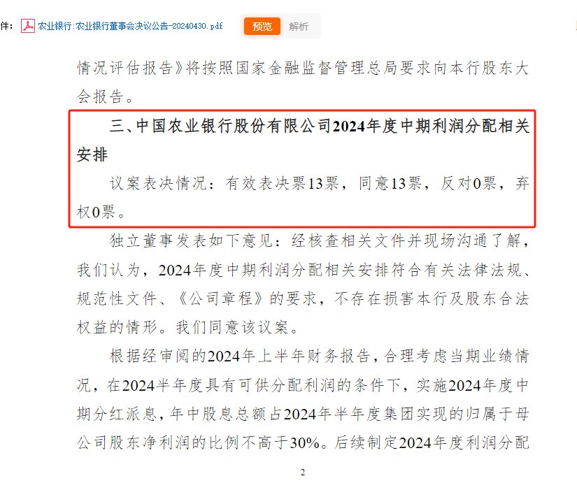 4月29日晚,建设银行、农业银行、工商银行、中国银行同时发布董事会决议公告称,审议通过2024年度中期利润分配相关安排。
