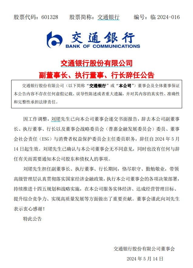 5月14日,交通银行发布公告称,因工作调整,刘珺已向该行董事会递交书面报告,辞去副董事长、执行董事、行长以及董事会战略委员会(普惠金融发展委员会)委员、董事会社会责任(ESG)与消费者权益保护委员会主任委员职务,辞任自2024年5月14日起生效。