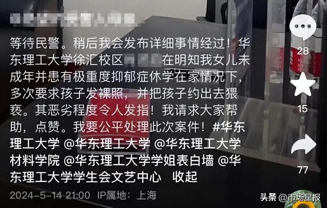 近日,上海一家长称12岁女儿被华东理工一男生索要裸照隔空猥亵引关注。