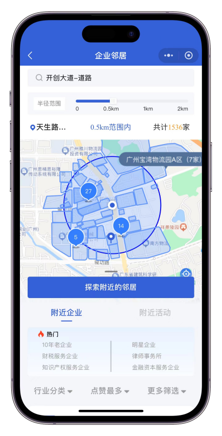 寻找合适的合作伙伴是企业发展过程中的重要一环。依托创新地址治理算法,“找伙伴”将企业与其所在楼宇/园区进行关联,企业点击进入“找伙伴”,输入搜索位置,选择展示的半径范围,即可查看附近的企业邻居,快速识别周边的潜在合作伙伴、竞争对手以及市场机会,实现资源共享、优势互补,快速搭建企业的私域“朋友圈”。