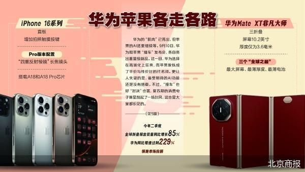 消费电子巨头“对撞”,今年的科技春晚看点十足,火药味更甚。与科技新品一同而至的,是热度十足的默契“对撞”背后,另一路“拼抢与厮杀”。9月10日,华为Mate XT非凡大师三折叠手机正式亮相,大屏、轻薄无疑是最大亮点。该款手机展开后屏幕达到10.2英寸,而厚度仅为3.6毫米,可以说是把平板电脑装进口袋。而同天发布的iPhone 16系列,与之相比显得乏善可陈,二者起售价也相差很远,一个是6000元,另一个是2万元,这一回,苹果成了平价与性价比的代名词,而华为却选择在高端化上一路狂奔。