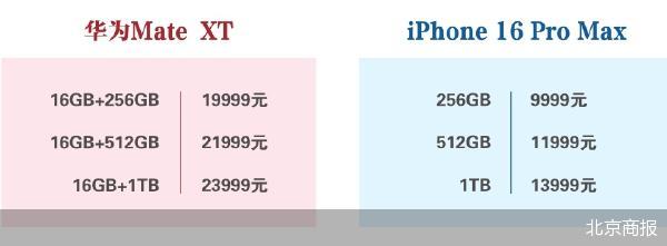 与之相比,华为三折叠16GB+256GB版本售价19999元,最高版本售价23999元,二者相差悬殊。