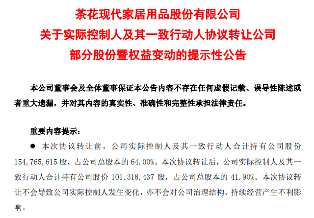 2023年11月24日晚,茶花股份发布公告,公司实际控制人及其一致行动人计划通过协议转让方式减持公司22.11%的股份,转让价格13.31元/股,合计套现超7亿元。