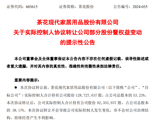 11月20日,茶花股份公告称,近日,公司收到实际控制人的通知,获悉其于2024年11月19日与深圳市达迈科技信息有限公司(以下简称“达迈科技”)签署了《股份转让协议书》,陈冠宇、陈葵生、陈福生、林世福拟通过协议转让方式分别将其所持有的公司股份1450.92万股、598.54万股、1290万股、302.91万股(合计3642.37万股,占公司总股本的15.06%)以18.60元/股的价格转让给受让方达迈科技,转让价款合计6.77亿元。