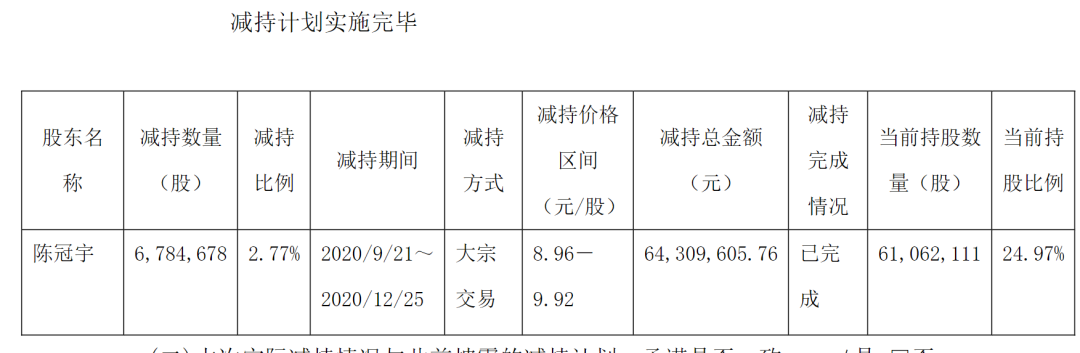 2020年9月21日至12月25日,实控人之一的陈冠宇通过大宗交易减持了678.47万股,占公司总股本的2.77%,减持价格区间为每股8.96—9.92元,套现约6400万元。