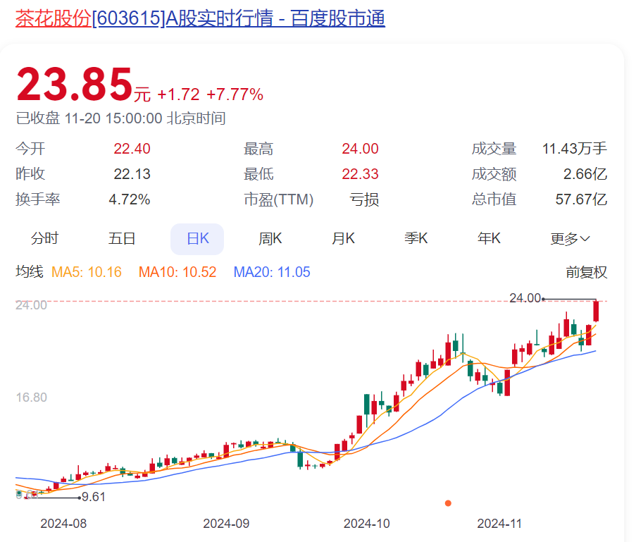 值得注意的是,虽然茶花股份今年业绩下滑,前三季度由盈转亏,但该公司股价近期却暴涨,近两个月翻了一番。截至11月20日收盘,茶花股份报收23.85元,总市值57.67亿元。
