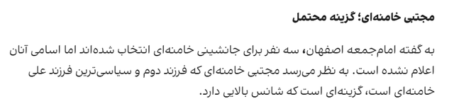 Entekhab报道截图。目前,没有权威媒体和官方证据显示阿里·哈梅内伊的次子穆杰塔巴·哈梅内伊已经被指定为候选人。近期,曾任伊朗议会司法调查和审查委员会秘书的政治活动家阿巴斯·帕利兹达尔(Abbas Palizdar)在采访中表示,穆杰塔巴是“继承领导权的重要选择之一”,可能成为专家会议的目标人选。