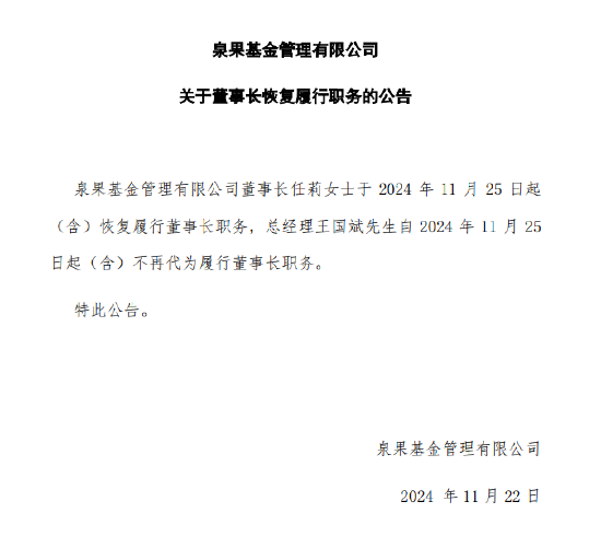 泉果基金今日公告称,公司董事长任莉于11月25日(下周一)起恢复履行董事长职务,总经理王国斌届时将不再代为履行董事长职务。