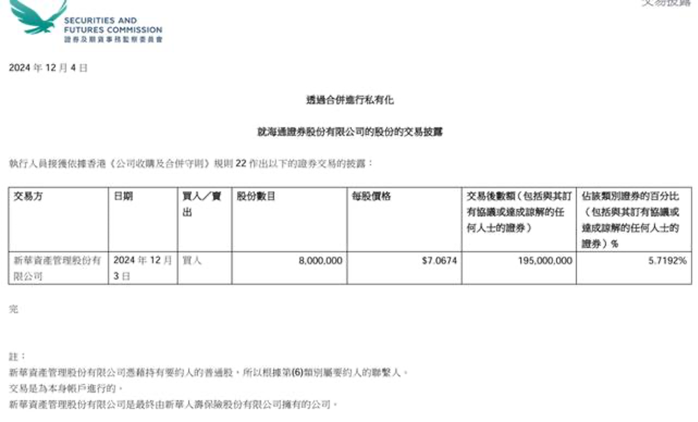 值得一提的是,海通证券(06837.HK)12月4日在港交所公告,新华保险资产管理有限公司于2024年12月3日增持买入800万股股份,每股价格7.0674港元,本次权益变动后持有股份为1.95亿股,占公司H股股份比例增至5.7192%。