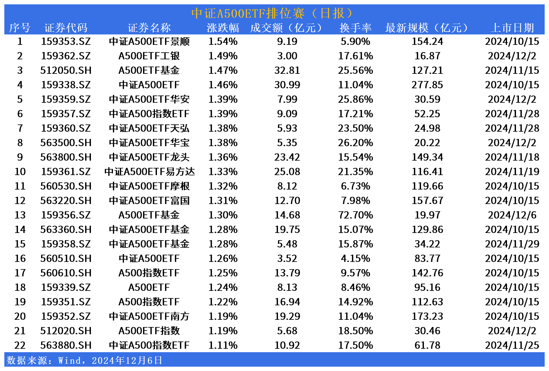 Wind数据显示,截止2024年12月6日收盘,中证A500ETF赛道产品数量扩容至22只,所有产品集体涨超1%;当日累计成交额达291.85亿元,较昨日大幅放量;平均换手率达17.83%,市场活跃度回升。