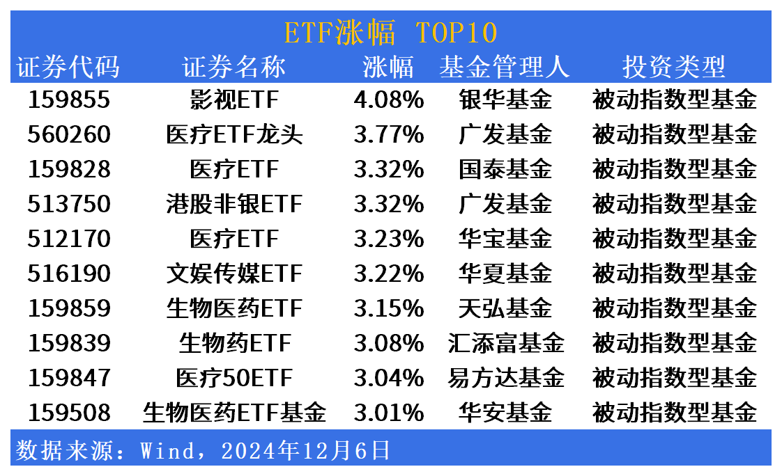 涨幅方面,影视ETF(159855)领涨超4%,医疗板块表现亮眼
