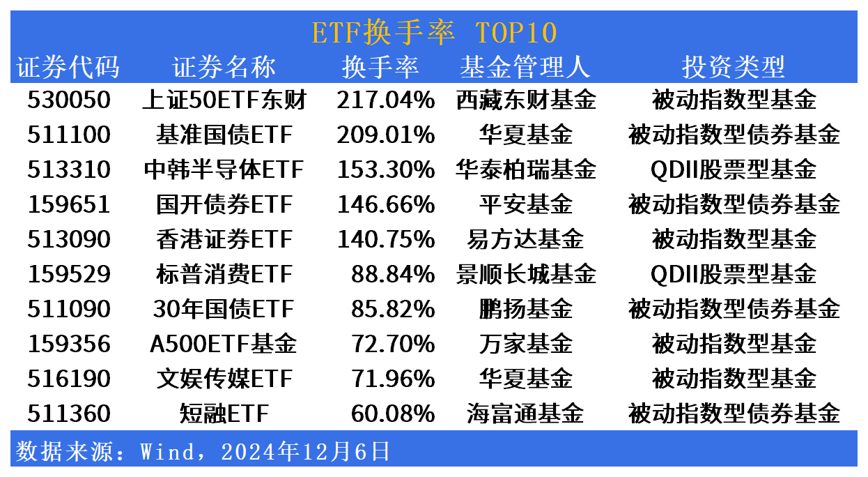 换手率方面,上证50ETF东财(530050)换手率超200%,居市场首位;基准国债ETF(511100)换手率达209.01%;中韩半导体ETF(513310)换手率居股票类产品首位。