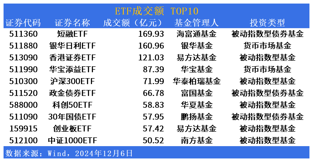 成交额方面,短融ETF(511360)成交额回落,达169.93亿元,银华日利ETF(511880)成交额紧随其后。香港证券ETF(513090)成交额居股票型ETF首位,达121.03亿元。