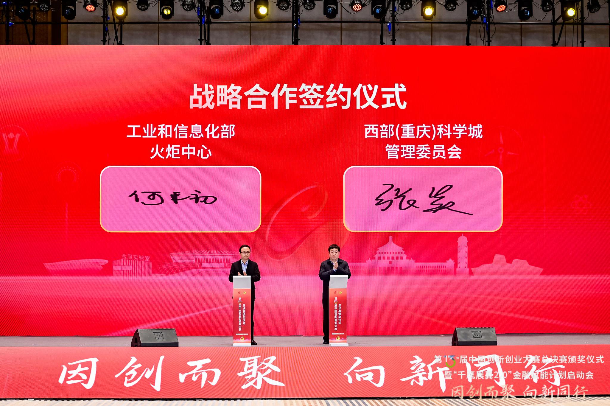 活动现场第十三届中国创新创业大赛以“因创而聚,向新同行”为主题,由地方赛、全国赛和颠覆性技术大赛、创新挑战赛、细分领域赛等专业赛组成。今年6月启动以来,全国37个地方赛区积极响应,31场专业赛事有序组织。经过激烈角逐,1000家企业成功入围全国赛。经过辽宁沈阳、浙江杭州、河北邯郸、江苏常州和江苏泰州五场全国赛的比拼,10家优胜企业进入总决赛并分获金银铜奖。总决赛颁奖活动现场还公布了大赛地方赛区最佳企业、创新创业50强、地方赛优秀组织单位、专业赛优秀组织单位等名单,并同步举行了工业和信息化部火炬中心与西部(重庆)科学城《战略合作框架协议》签约仪式、工业和信息化部火炬中心长三角中心和西南中心揭牌仪式、招商银行“千鹰展翼2.0”金融赋能计划等一系列活动。