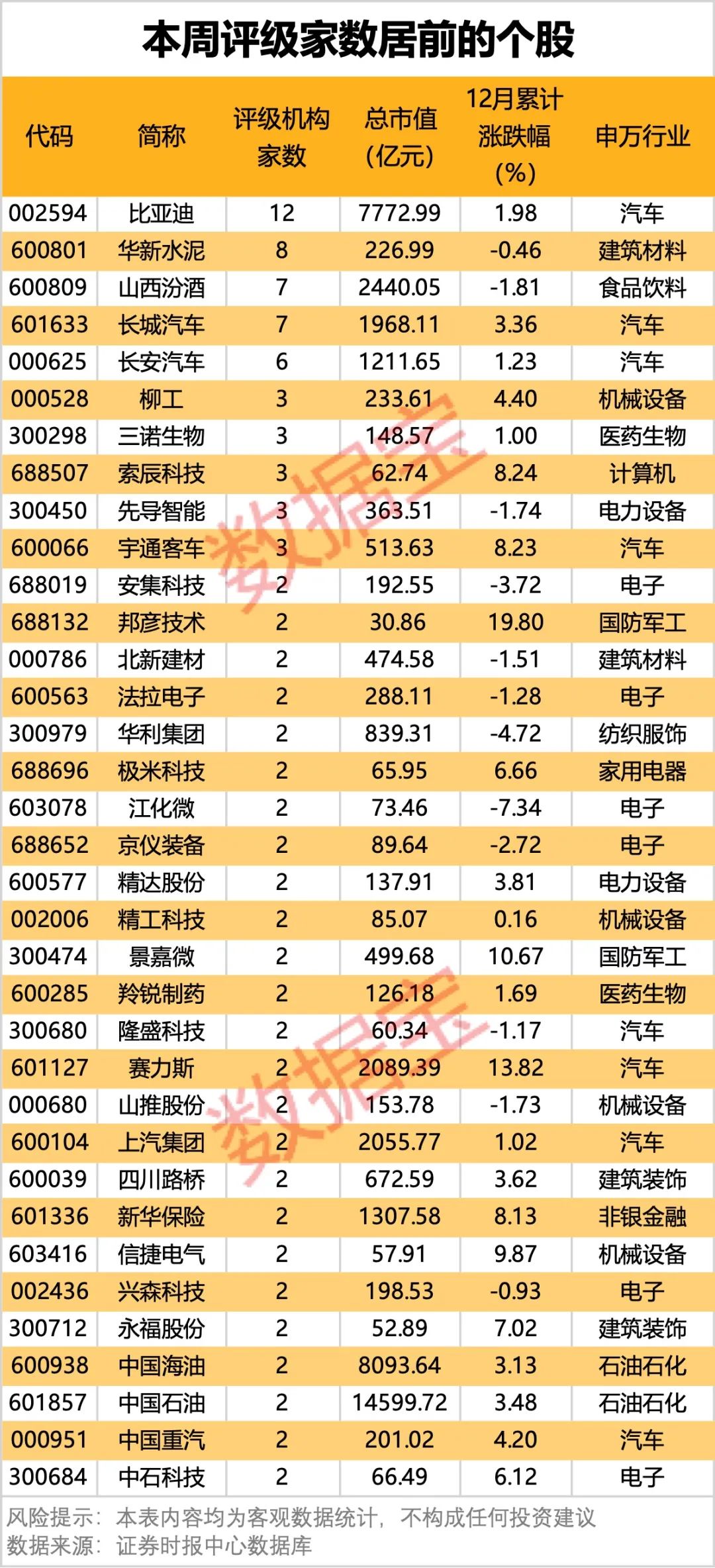 机构关注度最高的是比亚迪,有12家机构评级;紧随其后的是华新水泥,有8家机构评级。另外,长城汽车、长安汽车、宇通客车、隆盛科技、赛力斯等汽车股获机构重点关注。