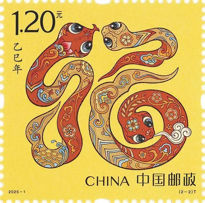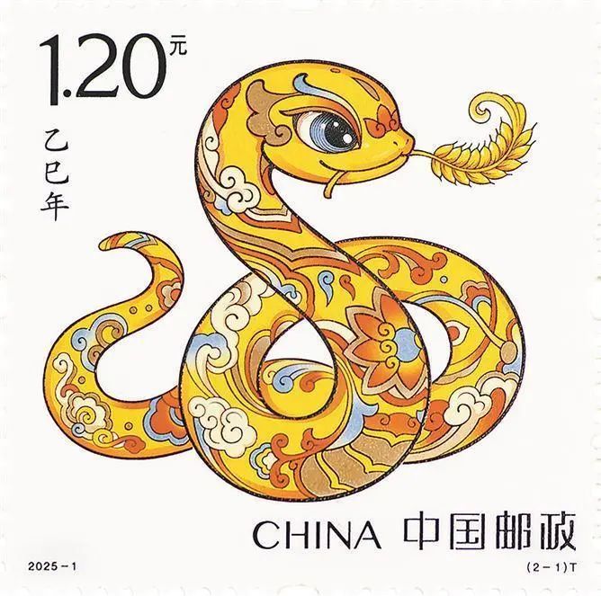 《乙巳年》邮票由中国邮政集团有限公司发行,共1套2枚。第一枚图名为“蛇呈丰稔”,画面提炼了中华传统文化中盘蛇的灵动意象,加以喜庆装饰应和年节氛围。金色的蛇躯蜿蜒,口中衔着一束“嘉禾”,象征着“仓廪实,衣食足”的美好图景。蛇身金光熠熠,与璀璨的麦穗交相辉映,寓意着风调雨顺之年,五谷丰登之景,以及国泰民安的盛世祥和。