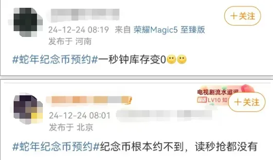 图片来源:长江云新闻值得注意的是,此前的2024年12月23日22时,2025年贺岁纪念币网上预约开启。当晚22时30分,2025年贺岁钞线上预约开启。根据多家银行公告,客户可登录手机银行、门户网站、个人网上银行及微信公众号进行预约,先到先得,额满为止。当时,不少网友反映,进入预约页面时,多家银行相关预约网页出现卡顿、无法访问等情况。也有网友反映,手机不停地接收银行验证码,就是抢不到……