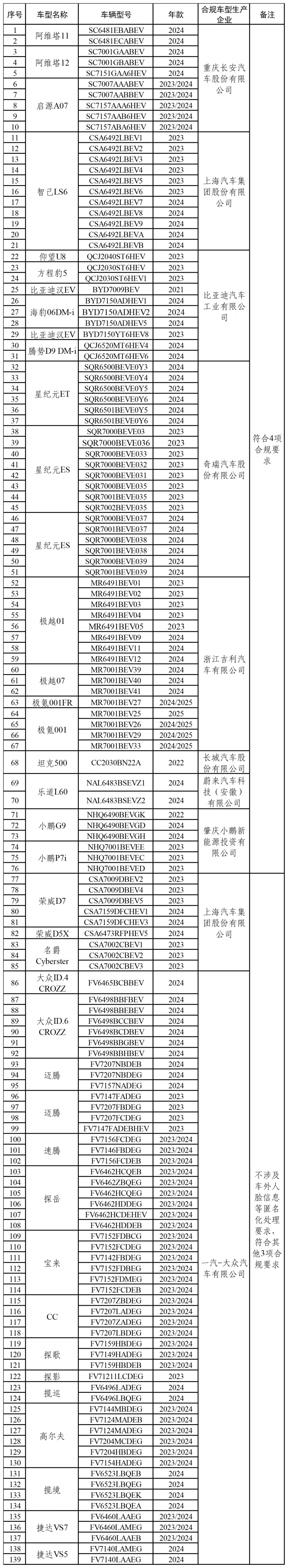 1月7日,中国汽车工业协会、国家计算机网络应急技术处理协调中心发布通报,依据有关规定,按照企业自愿送检原则,自2024年9月起,组织对汽车制造商汽车产品数据安全合规情况(涵盖车外人脸信息等匿名化处理、默认不收集座舱数据、座舱数据车内处理、处理个人信息显著告知等4项合规要求)进行检测,其中重庆长安、上汽、比亚迪、奇瑞、吉利、长城、蔚来、小鹏、一汽-大众等9家企业的139款车型符合汽车数据安全4项合规要求(部分车型不涉及车外人脸信息等匿名化处理要求)。