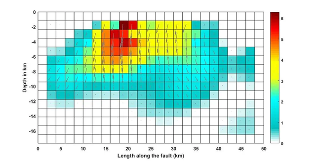 措果乡震后影像图基于InSAR同震变形场,利用PSOKINV反演本次地震的破裂参数,初步结果显示,本次地震的断层走向为187°,倾角为36°,平均rake角度为90°,是以正断层占主导的断裂错动过程。从分布式地震破裂模型中可以看出,本次地震的最大破裂位置较浅,主要集中在1-5公里深度,最大的位错量达到6米。