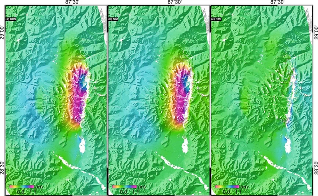 应急拍摄的结果显示,本次地震震源机制为拉张型。从InSAR结果也证明,本次地震是一个正断层破裂过程,推断发震断裂为登么错断裂。InSAR结果显示,震中最大LOS向变形发生在上盘,最大的变形量接近2米。InSAR结果快速锚定地震极震区,为地震现场应急提供了有力的技术支撑。
