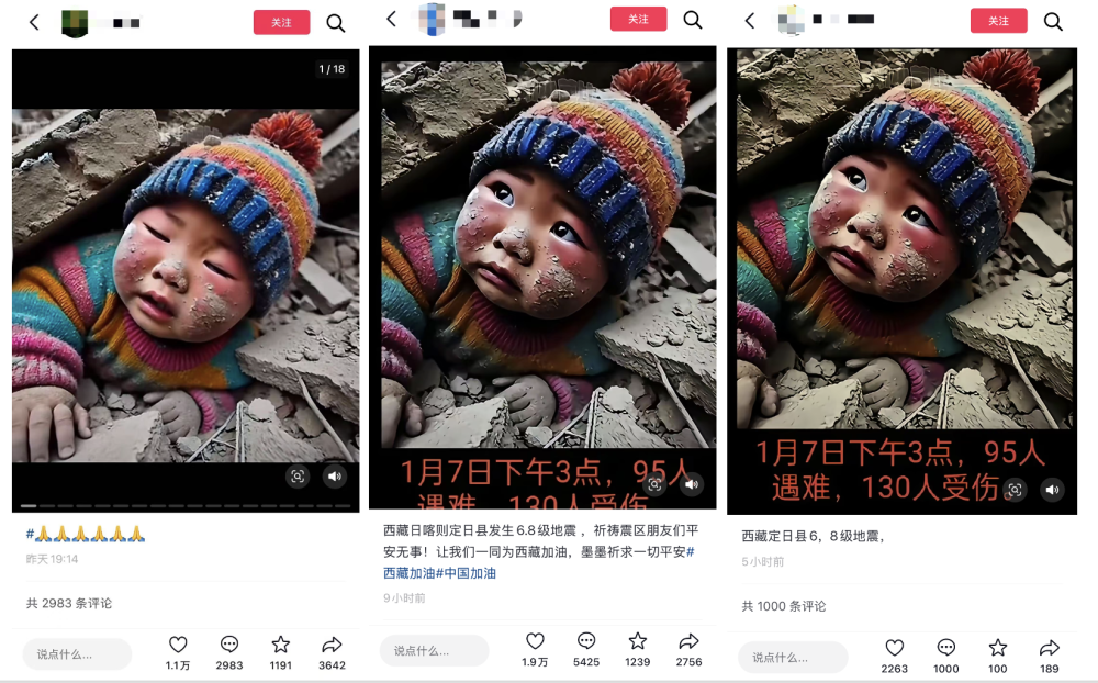 1月7日9时05分,西藏日喀则市定日县发生6.8级地震,灾情牵动人心,许多网友在社交平台上为灾民祈福。与此同时,一些疑似虚假信息,比如AI制造的图片,正在造成广泛误导。