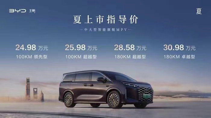 1月8日,比亚迪夏正式上市,共有4款配置,分为CLTC工况续航100km/180km,2种纯电续航版本。并提供4种外观颜色及2种内饰配色可选,售价为24.98万-30.98万元。这一起步价格也远低于预售价,足见比亚迪夏对于中大型MPV势在必得。
