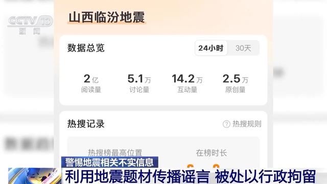 就在10日当天,中国地震台网正式测定,1月10日20时31分,在山西临汾市尧都区(北纬36.16度,东经111.23度)发生4.1级地震,震源深度20千米。地震发生以后,“山西临汾地震”话题迅速登上多家网络平台热搜榜首位,仅6小时,话题阅读量高达2亿,以及5.1万讨论量和14.2万互动量。