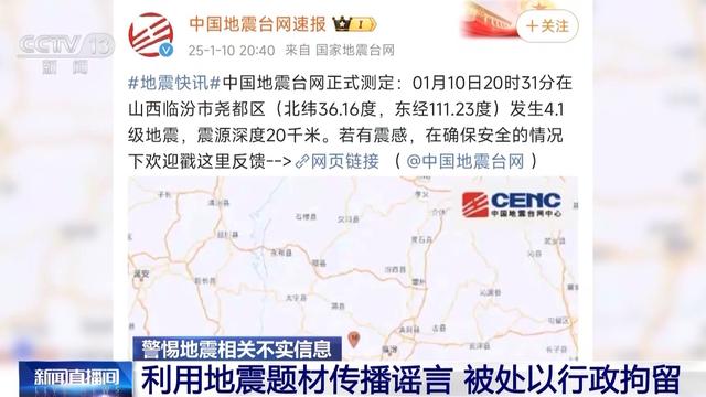 据山西网警1月10日发布消息称,1月7日,有人在某短视频平台发布消息称,“大同1月6日晚上12点发生了9.6级地震,最为严重的是大同天镇县,受灾最严重”。随后,大同市防震减灾中心很快发布辟谣声明,明确表示该地区并未发生所传地震灾情。警方已将发布谣言者杨某江抓获,根据相关法律法规,杨某江被处以行政拘留十日的处罚。