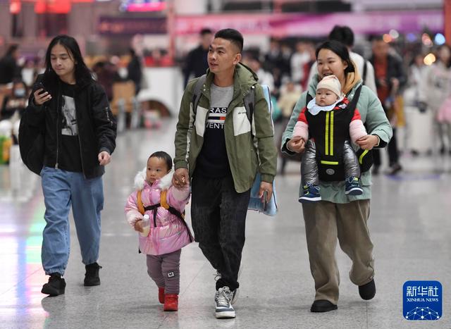 2025年1月14日,在西安站候车大厅,小朋友和家人准备进站乘车。新华社记者 李一博 摄从绿皮车到动车“陆地舰队”