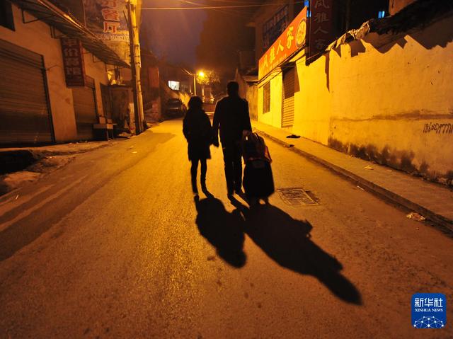 2011年1月24日凌晨,田仕彬(右)和鲍琴(左)走在寂静的湖北恩施市街道上,准备天亮后找车回鹤峰县。他们历经火车的拥挤、山路的颠簸,经过一天一夜艰辛旅程后,才终于到达家里与亲人团聚。新华社记者 程敏 摄