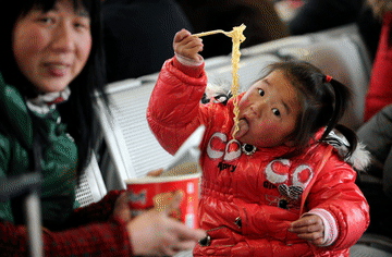 2011年1月19日,旅客在合肥火车站候车室吃方便面。新华社记者 李健 摄
