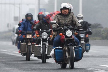 2017年1月19日,在广东佛山务工的广西籍务工人员陈一锋、徐丽宁夫妇(前)骑行在回家过年的路上。 新华社记者 王建华 摄