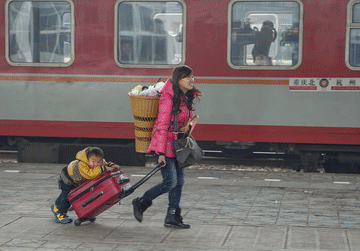 2013年1月25日,下了火车的“小候鸟”沈毅跟着妈妈从浙江杭州回重庆秀山县老家过春节。新华社记者 陈诚 摄